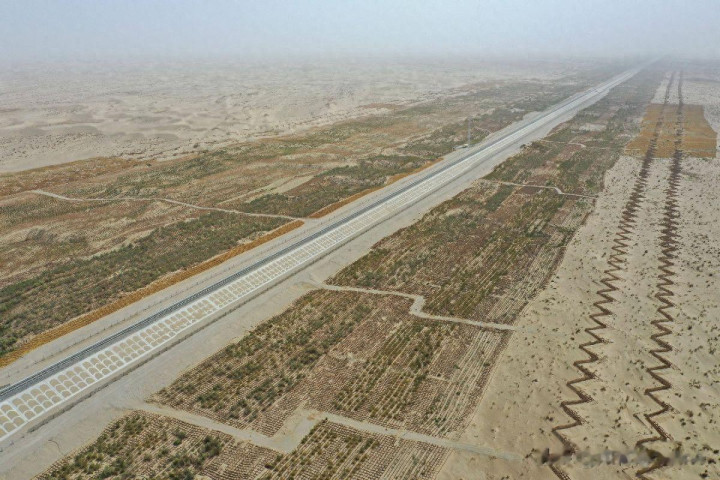 {jz:field.toptypename/}铁路双方,先立起混凝土拒绝墙,死死挡住流沙;再铺上网格固沙,种上植被。墙、网、草三层重叠,硬是在沙漠里筑起了扫数立体障蔽。